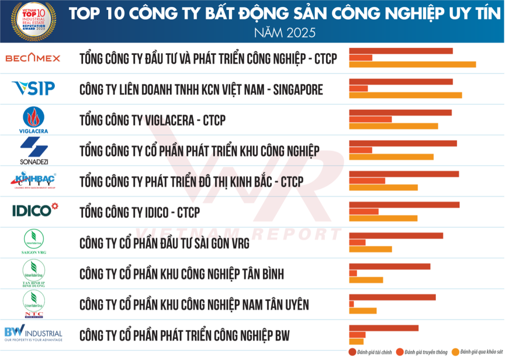 On March 21, 2025, Vietnam Report officially announced the Top 10 Reputable Industrial Real Estate Companies for 2025. This is the result of an independent study conducted by Vietnam Report based on scientific and objective principles aimed at recognizing and honoring key players in the real estate sector who have made significant achievements in providing products to customers, building a strong public and investor image, and demonstrating financial stability after navigating challenging times. The companies were selected from a database of Vietnamese enterprises within the real estate sector, employing updated financial information as of December 31, 2024, combined with media coding techniques, surveys of relevant stakeholders, and comprehensive assessments to ensure objectivity.